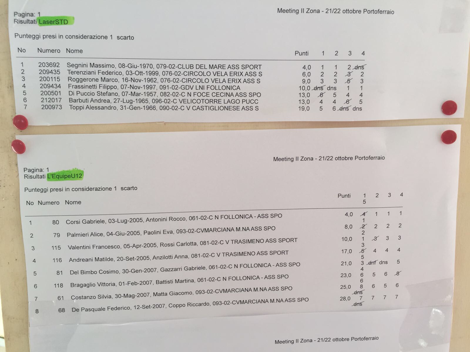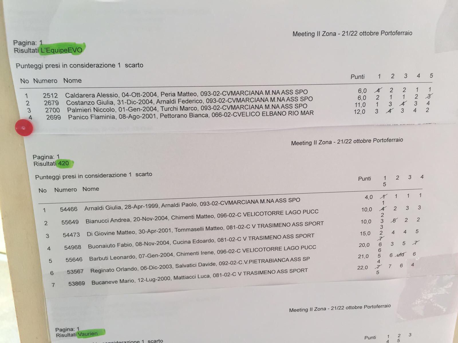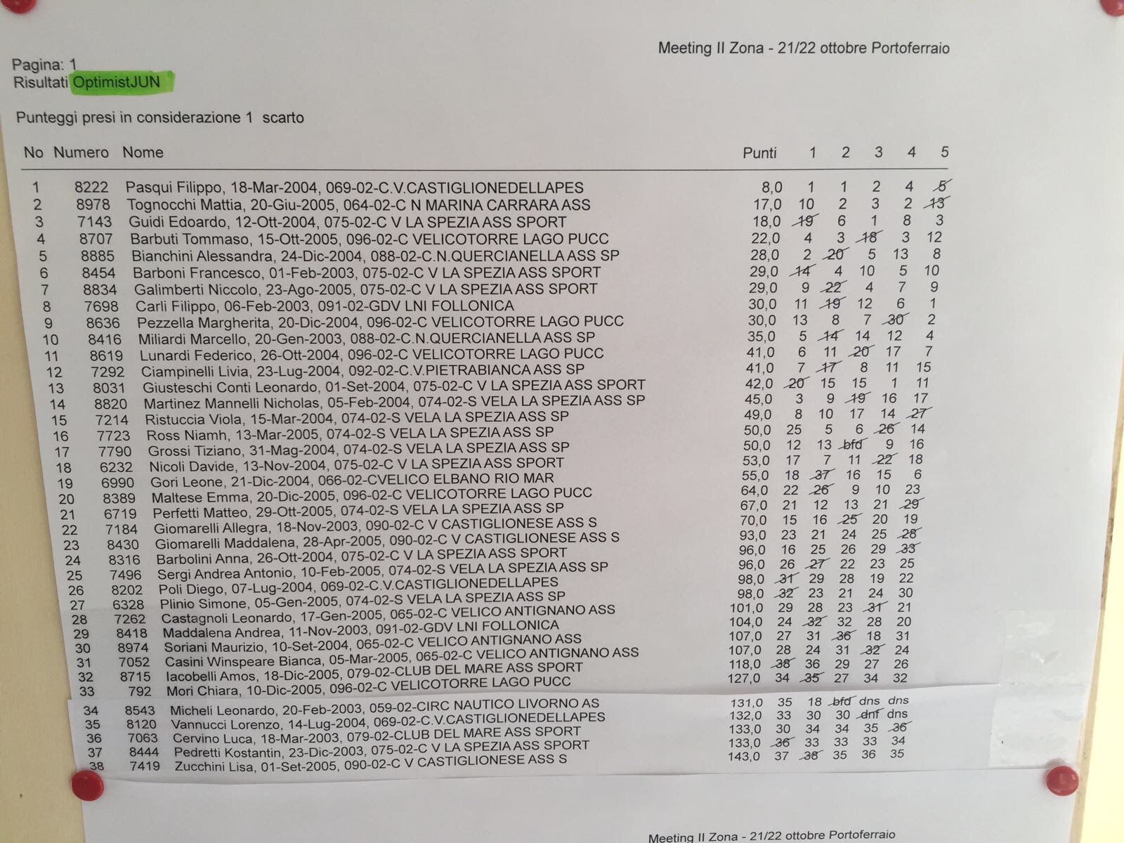 Negli Optimist, categoria juniores, vince Filippo Pasqui del CV Castiglionese davanti a Mattia Tognocchi del CN Marina di Carrara, che precede di un solo punto il nostro Edoardo Guidi, vincitore della terza prova del sabato. Poco dietro: Francesco Barboni (6°), Nicolò Galimberti (7°), Leonardo Giusteschi Conti (13°), vincitore della prima prova della domenica e Davide Nicoli (18°).